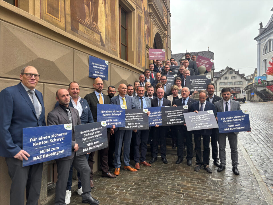 Freude herrscht: Der Schwyzer Kantonsrat hat am 22. Oktober 2025 die Volksinitiative der SVP gegen den Bau von Bundesasylzentren im Kanton Schwyz angenommen. Dieser Erfolg ist das Resultat des konsequenten Einsatzes der SVP – und zeigt einmal mehr: Dranbleiben lohnt sich. Mit dem heutigen Entscheid liegt der Ball nun beim Regierungsrat: Die Pläne für ein Bundesasylzentrum in Buosingen (Goldau) sind umgehend zu sistieren, und der Entscheid des Kantonsrates ist entsprechend umzusetzen.